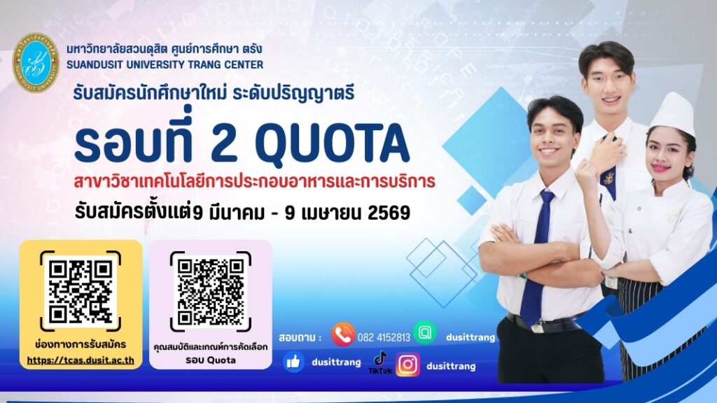 มหาวิทยาลัยสวนดุสิต เปิดรับสมัครนักศึกษาภาคปกติ ระดับปริญญาตรี ปีการศึกษา 2569 รอบที่ 2 Quota 9 มีนาคม ถึง 9 เมษายน 2569
