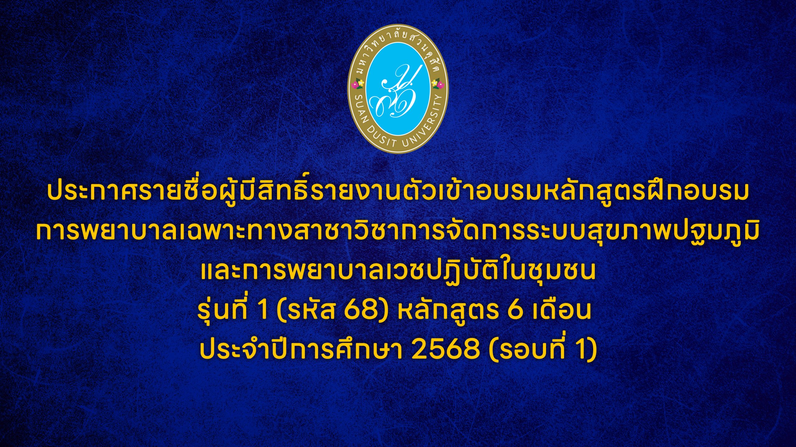 ประกาศรายชื่อผู้มีสิทธิ์รายงานตัวเข้าอบรมหลักสูตรฝึกอบรมการพยาบาลเฉพาะทางสาชาวิชาการจัดการระบบสุขภาพปฐมภูมิและการพยาบาลเวชปฏิบัติในชุมชนรุ่นที่ 1 (รหัส 68) หลักสูตร 6 เดือนประจำปีการศึกษา 2568 (รอบที่ 1)