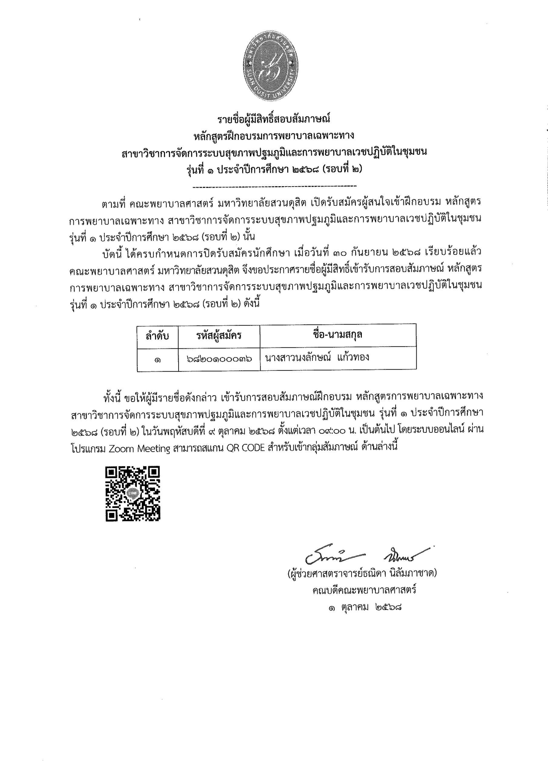 ประกาศรายชื่อผู้มีสิทธิ์สอบสัมภาษณ์หลักสูตรฝึกอบรมการพยาบาลเฉพาะทางสาขาวิชาการจัดการระบบสุขภาพปฐมภูมิและการพยาบาลเวชปฏิบัฏิบัติในชุมชน รุ่นที่ 1 ประจำปีการศึกษา 2568 (รอบที่ 2)