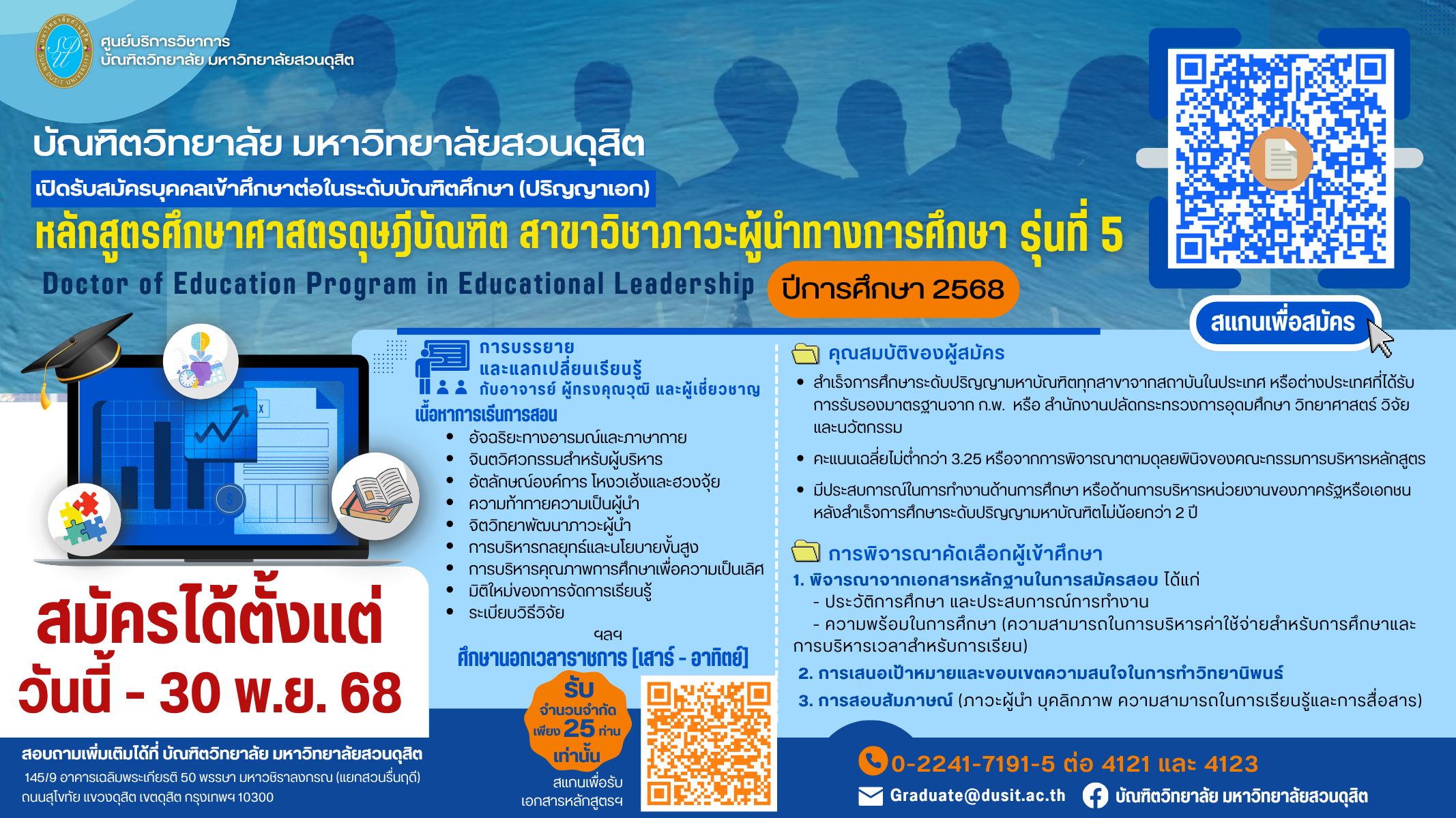 บัณฑิตวิทยาลัย มหาวิทยาลัยสวนดุสิต เปิดรับสมัครผู้สนใจเข้าศึกษา หลักสูตรศึกษาศาสตรดุษฎีบัณฑิต สาขาวิชาภาวะผู้นำทางการศึกษา