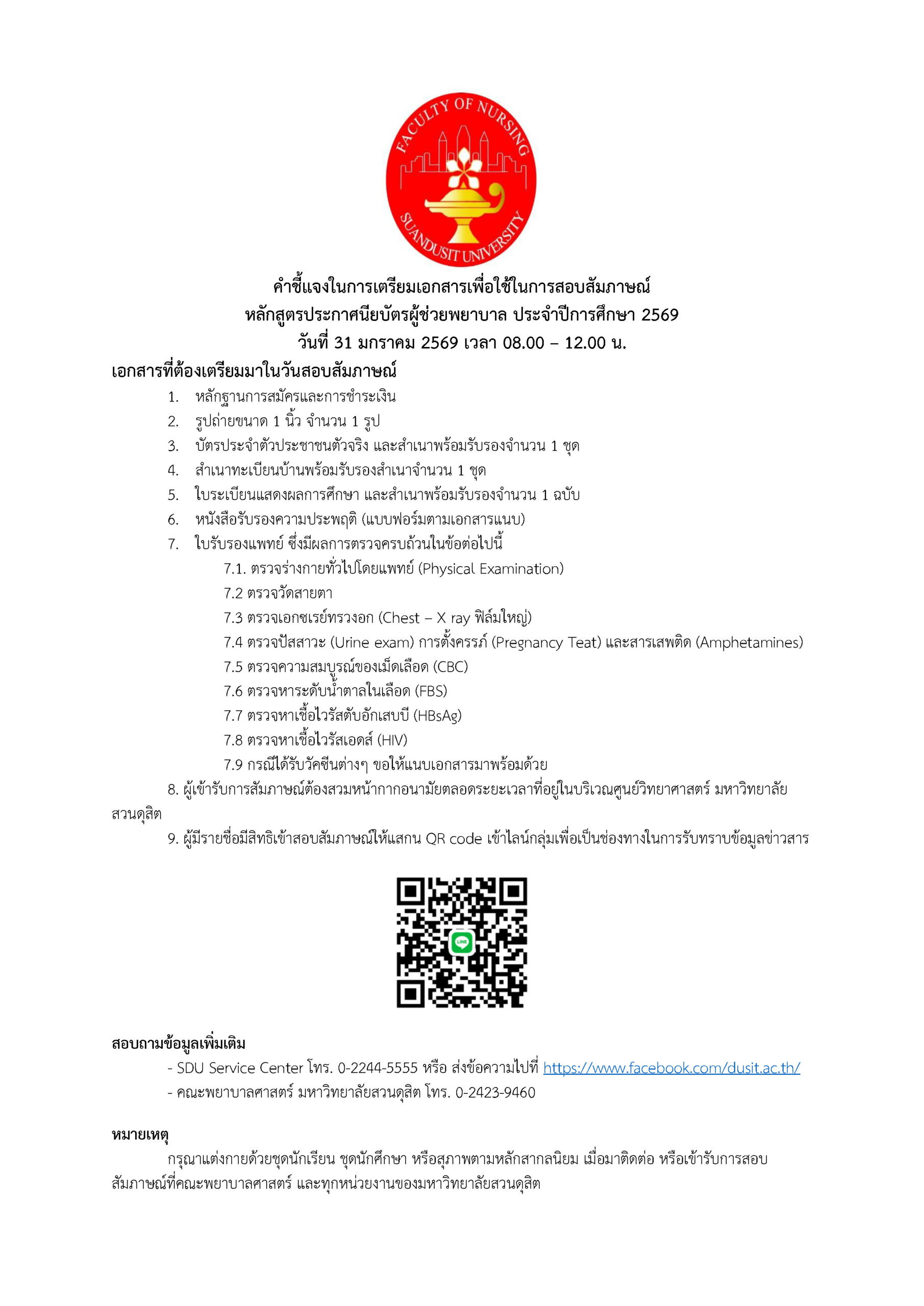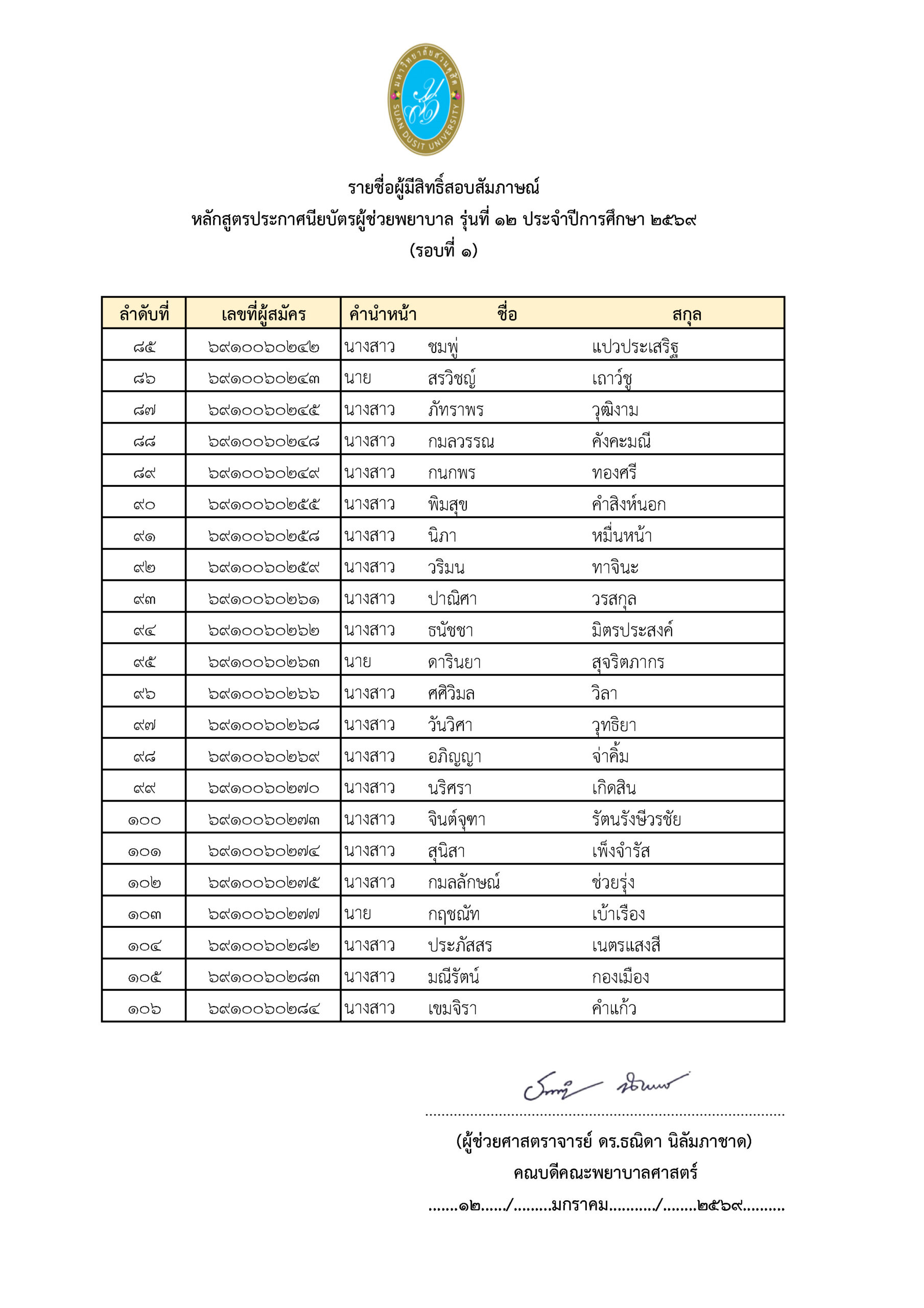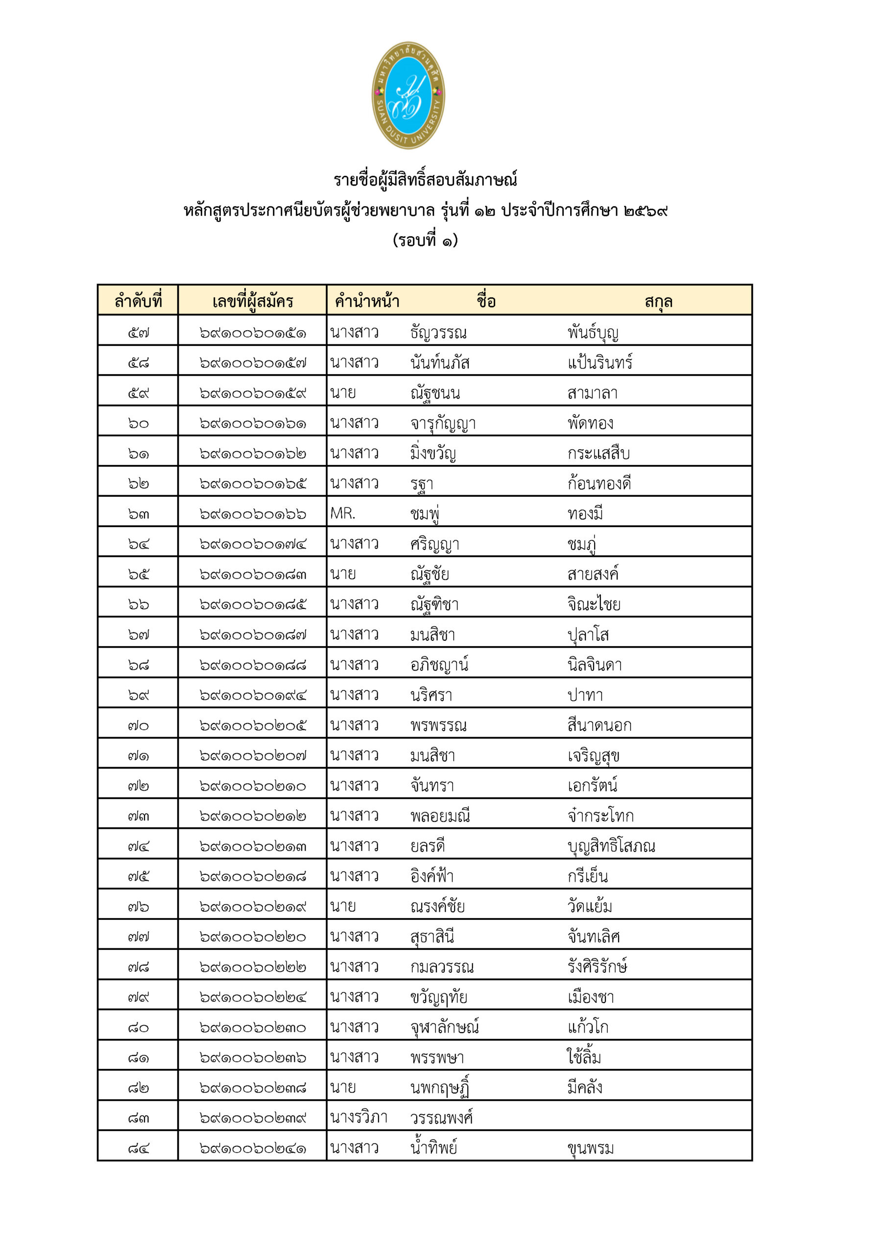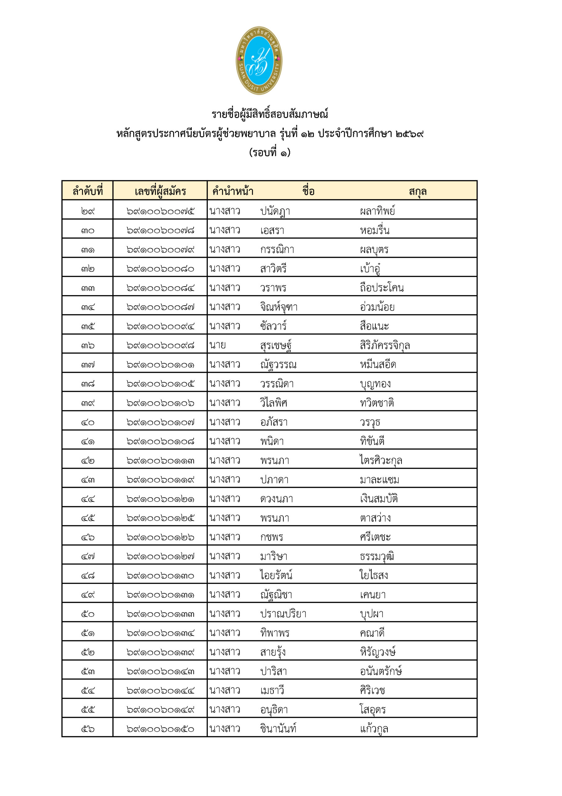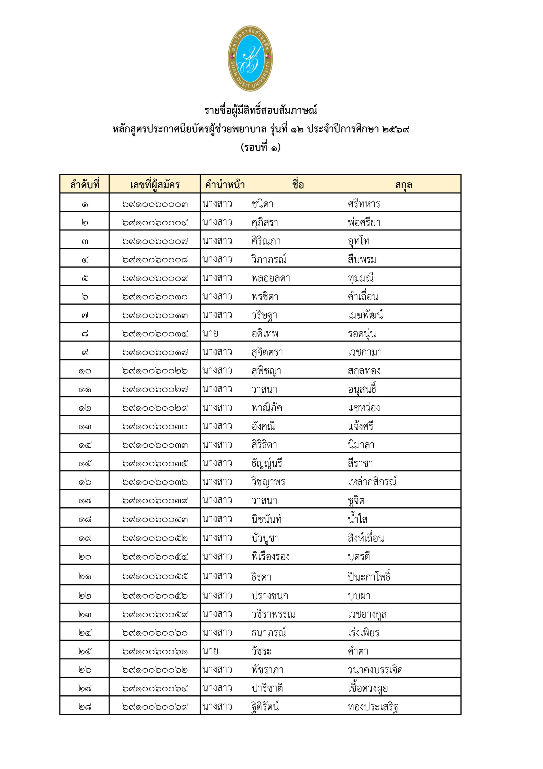 ประกาศรายชื่อผู้มีสิทธิ์สอบสัมภาษณ์หลักสูตรประกาศนียบัตรผู้ช่วยพยาบาลรุ่นที่ 12 ประจำปีการศึกษา 2569