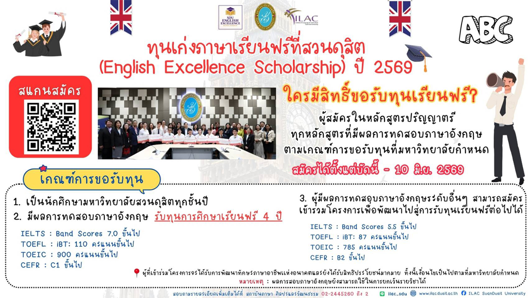 English Excellence Scholarship ปี 2569 เปิดรับสมัครแล้ว! สถาบันภาษา ศิลปะและวัฒนธรรม (ILAC) มหาวิทยาลัยสวนดุสิต ขอเชิญชวนนักศึกษาระดับปริญญาตรีทุกชั้นปีที่มีความสามารถด้านภาษาอังกฤษ สมัครเข้าร่วมโครงการ “ทุนเก่งภาษา เรียนฟรีที่สวนดุสิต”