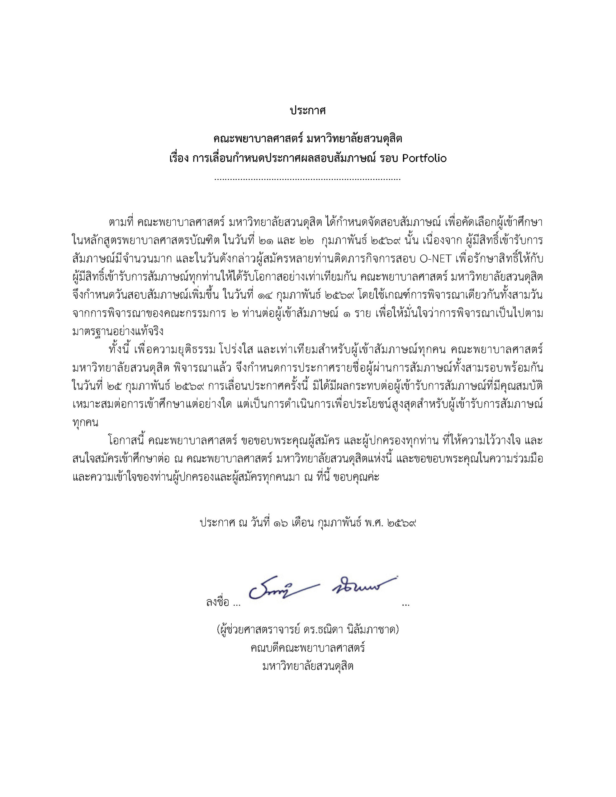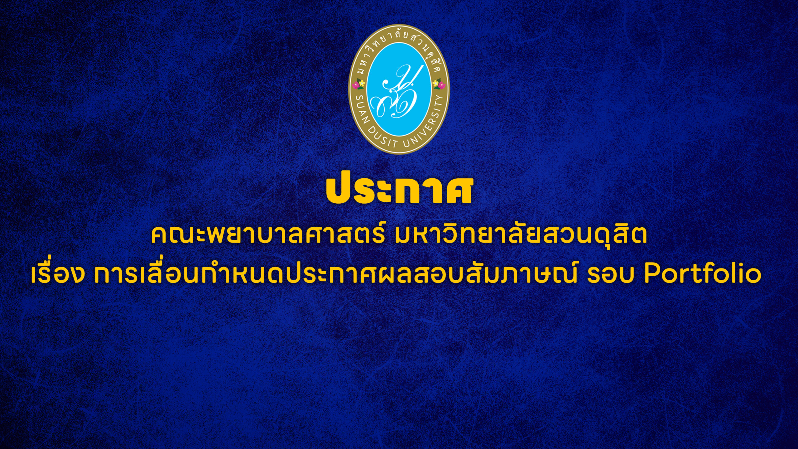 ประกาศ คณะพยาบาลศาสตร์ มหาวิทยาลัยสวนดุสิต เรื่อง การเลื่อนกำหนดประกาศผลสอบสัมภาษณ์ รอบ Portfolio