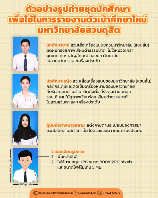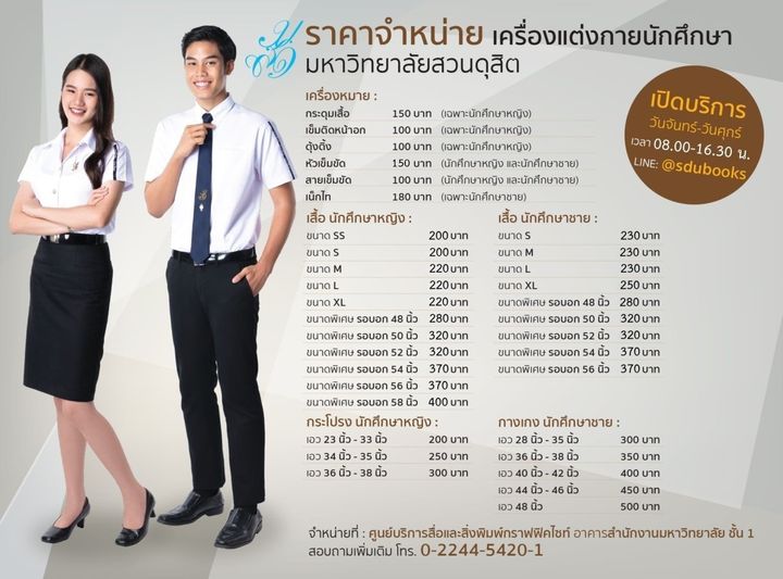 ** สามารถซื้อเครื่องแบบและเครื่องหมายนักศึกษามหาวิทยาลัยสวนดุสิตได้ที่ ศูนย์บริการสื่อละสิ่งพิมพ์กราฟฟิคไซท์ อาคารสำนักงานมหาวิทยาลัย ชั้น 1 เปิดบริการ จันทร์ถึงศุกร์ เวลา 8.30-16.30 น. หรือ สั่งซื้อ online ได้ที่ Line : @sdubooks มีบริการจัดส่งทางไปรษณีย์