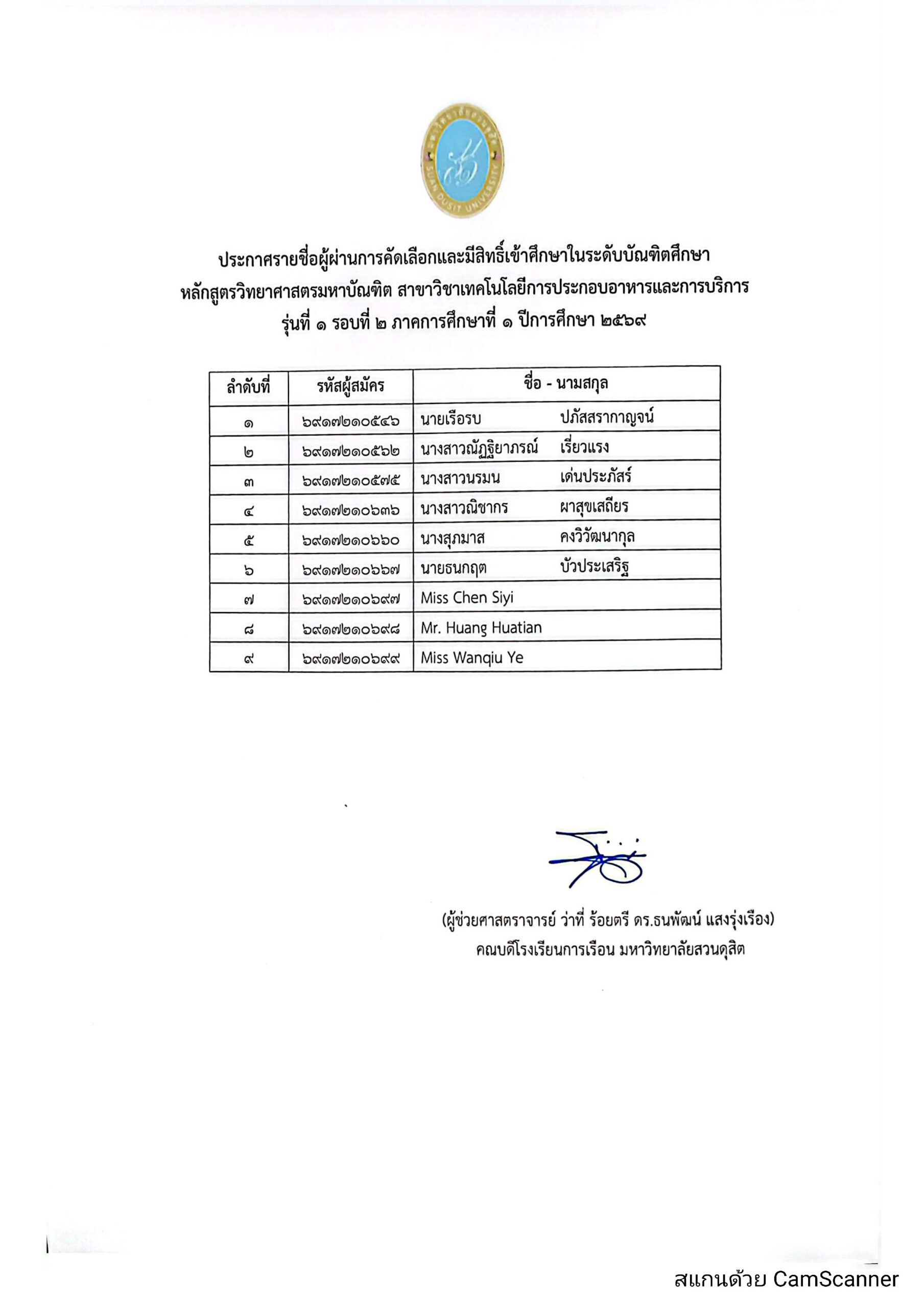 หลักสูตรวิทยาศาสตรมหาบัณฑิต สาขาวิชาเทคโนโลยีการประกอบอาหารและการบริการปีการศึกษา มหาวิทยาลัยสวนดุสิต ประกาศรายชื่อผู้ผ่านการคัดเลือกและมีสิทธิ์เข้าศึกษา ในระดับบัณฑิตศึกษา รายงานตัว online ได้ที่ https://academic.dusit.ac.th/academic/Application.sdu?mode=initLoginStudentOnline