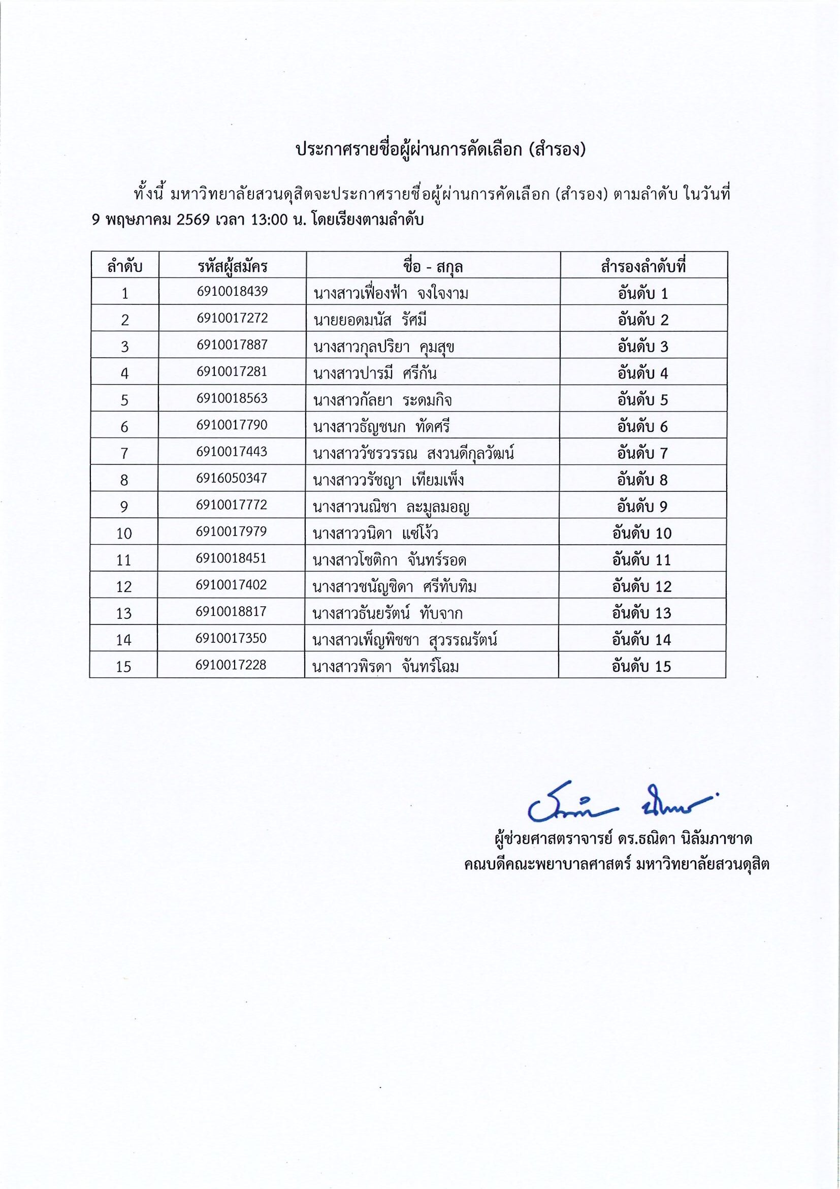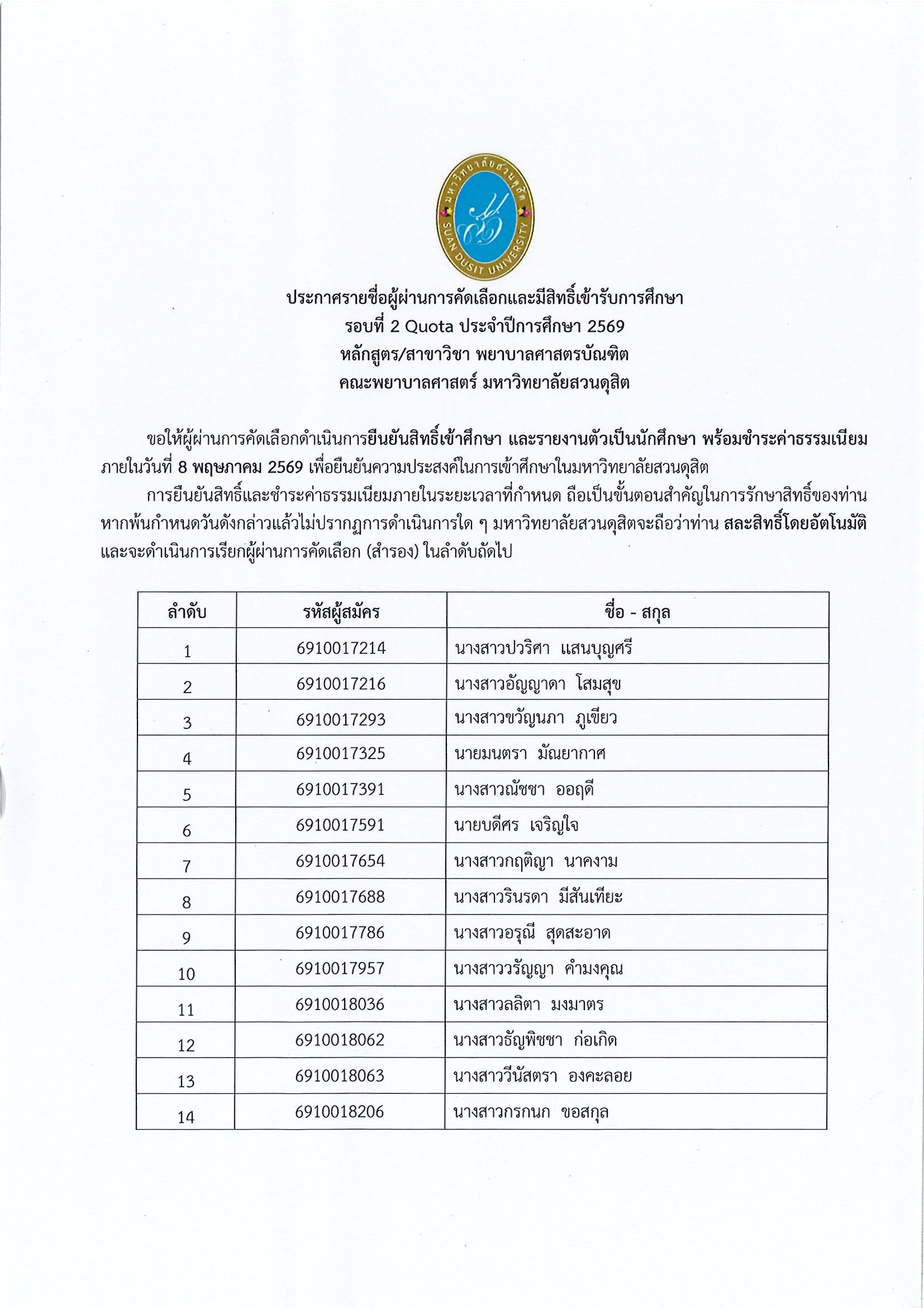 หลักสูตรพยาบาลศาสตรบัณฑิต คณะพยาบาลศาสตร์ มหาวิทยาลัยสวนดุสิต ประกาศรายชื่อผู้ผ่านการคัดเลือกและมีสิทธิ์เข้าศึกษา รายงานตัว online ได้ที่ https://academic.dusit.ac.th/academic/Application.sdu?mode=initLoginStudentOnline