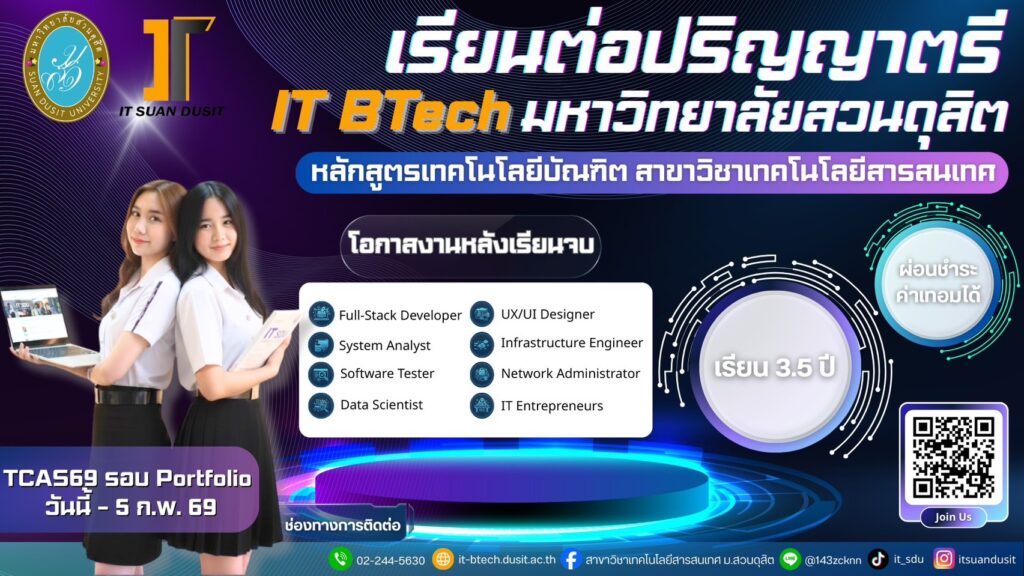 มหาวิทยาลัยสวนดุสิต ขยายเวลาเปิดรับสมัครนักศึกษาภาคปกติ ระดับปริญญาตรี ปีการศึกษา 2569 รอบที่ 1 Portfolio ถึง 5 กุมภาพันธ์ 2569