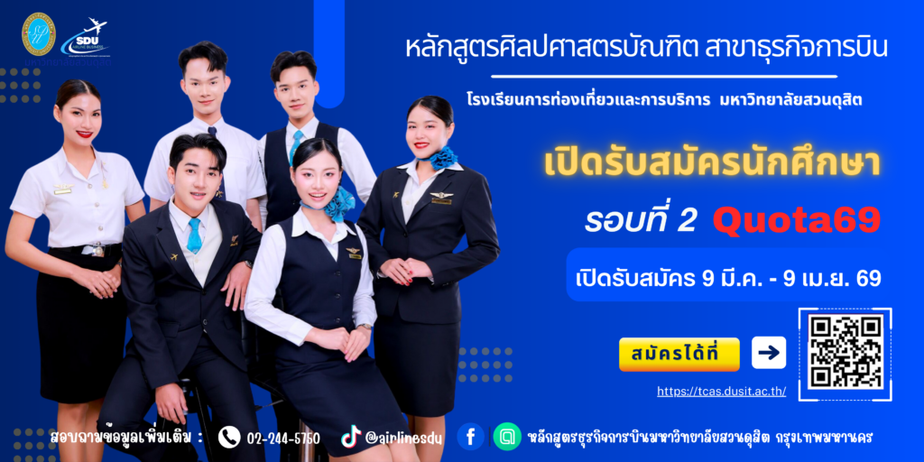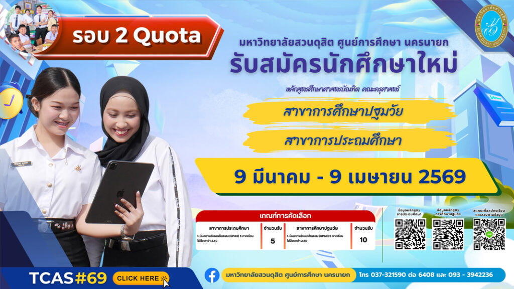 มหาวิทยาลัยสวนดุสิต เปิดรับสมัครนักศึกษาภาคปกติ ระดับปริญญาตรี ปีการศึกษา 2569 รอบที่ 2 Quota 9 มีนาคม ถึง 9 เมษายน 2569