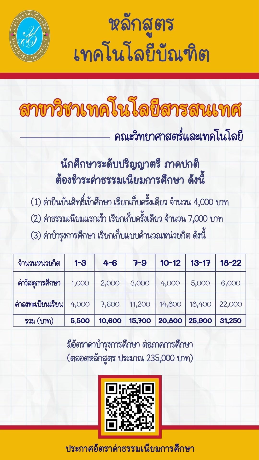 4. สอบสัมภาษณ์ (เงื่อนไข ชำระค่าสมัคร และส่งแฟ้มสะสมผลงาน หลักสูตรจึงติดต่อเพื่อนัดสัมภาษณ์ทางอีเมลที่สมัคร) ติดต่อสอบถาม itsdu@dusit.ac.th , https://www.facebook.com/IT.SDUPAGE/