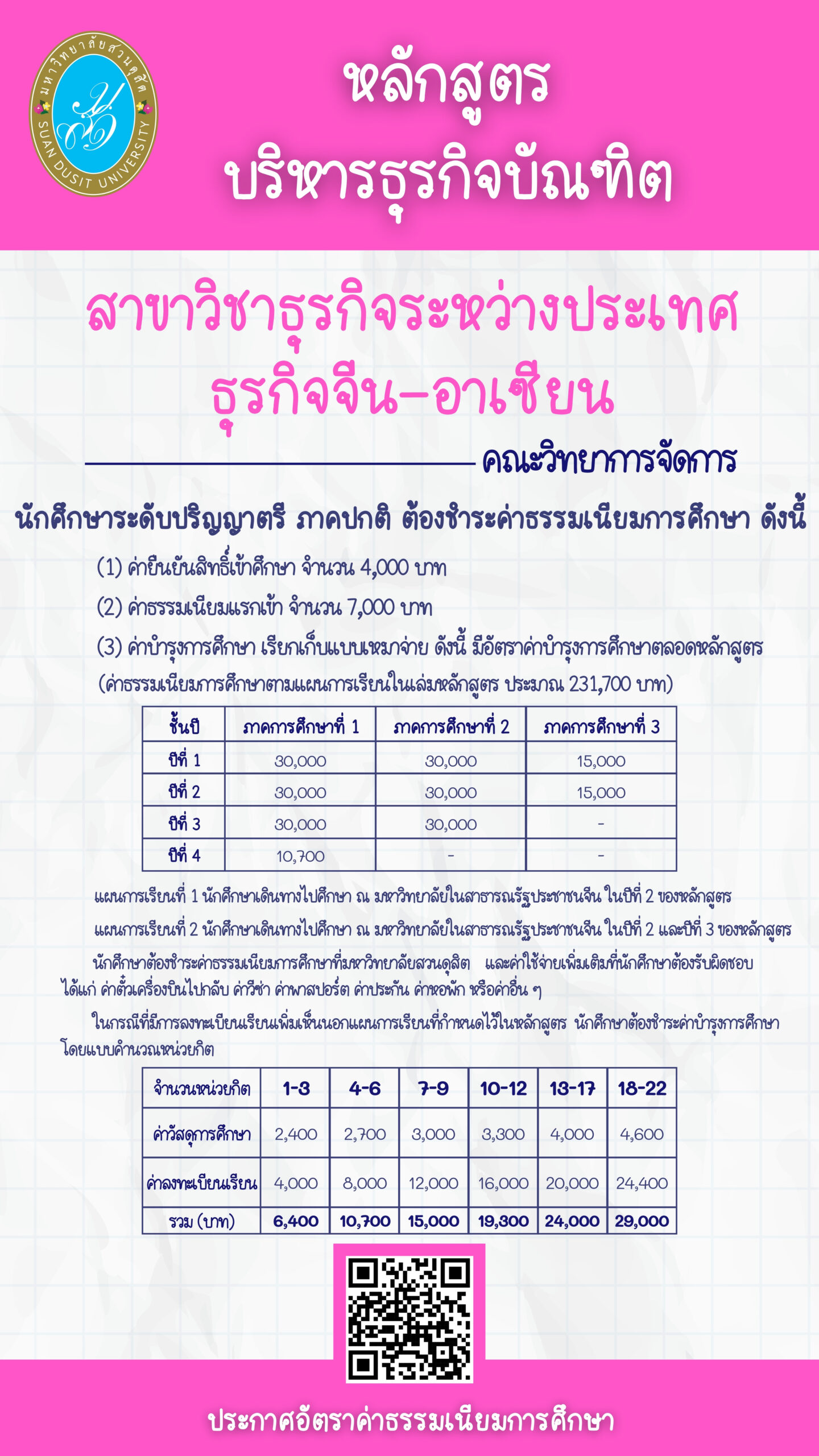 หมายเหตุ: ผู้สมัครที่มีสัญชาติจีนไม่มีสิทธิ์ในการสมัครเข้าศึกษาในหลักสูตรนี้ ซึ่งเป็นไปตามข้อตกลงในการจัดการศึกษาร่วมระหว่างมหาวิทยาลัยสวนดุสิตกับมหาวิทยาลัยในสาธาณรัฐประชาชนจีน