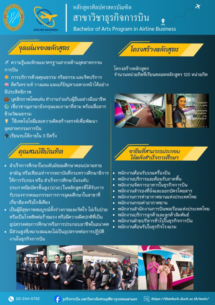 หมายเหตุ: ผู้สมัครที่เลือกเรียนสาขาวิชาธุรกิจการบิน (กรุงเทพมหานคร) เมื่อเข้าศึกษาในชั้นปีที่ 1 ต้องเรียนปรับพื้นฐานการจัดการเรียนการสอนที่มหาวิทยาลัยสวนดุสิต ณ วิทยาเขตสุพรรณบุรี 1 ปี และ ชั้นปีที่ 2 – 4 กลับมาจัดการเรียนการสอน ณ มหาวิทยาลัยสวนดุสิต (กรุงเทพมหานคร)