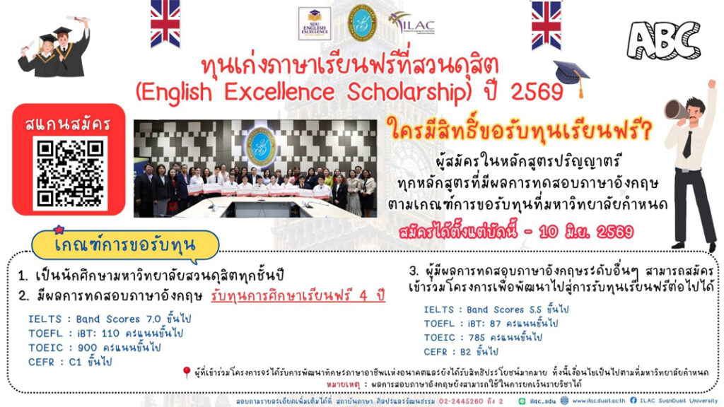 “เก่งภาษาเรียนฟรีที่สวนดุสิต” มหาวิทยาลัยสวนดุสิต เปิดรับสมัครนักศึกษาที่มีความสามารถทางทักษะภาษาอังกฤษ