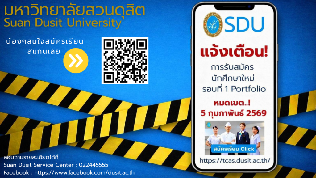 มหาวิทยาลัยสวนดุสิต ขยายเวลาเปิดรับสมัครนักศึกษาภาคปกติ ระดับปริญญาตรี ปีการศึกษา 2569 รอบที่ 1 Portfolio ถึง 5 กุมภาพันธ์ 2569
